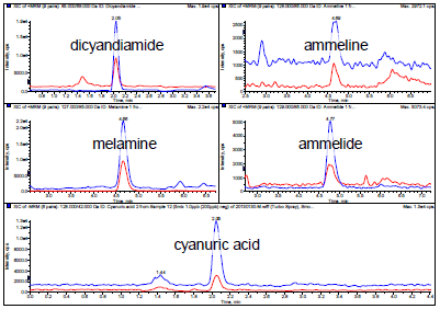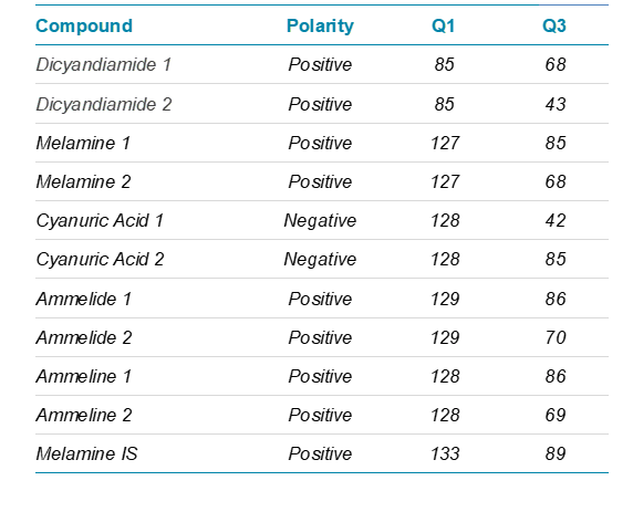 Mass spectrometry: The SCIEX QTRAP 5500 LC-MS/MS System was used with the Turbo V™ Ion Source and an electrospray ionization (ESI) probe. The mass spectrometer was operated in multiple reaction monitoring (MRM) mode using fast switching between negative and positive polarity. Two selective MRM transitions were monitored for each analyte using the ratio of quantifier and qualifier ion for identification (Table 2). 13C315N3-melamine was used as an internal standard.