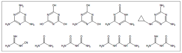 Analytical methods to detect potential adulterants (non-protein nitrogen sources), including amidinourea, ammelide, ammeline, biuret, cyanuric acid, cyromazine, dicyandiamide, melamine, triuret and urea (Figure 1) have been developed and validated to test milk products and bulk protein.4, 5