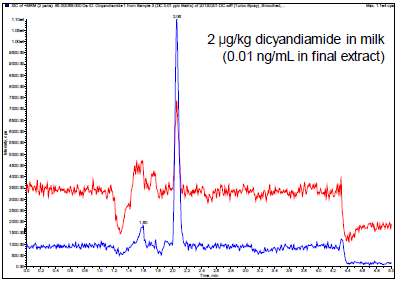 First, the limit of detection (LOD) and reproducibility were evaluated using injections of dicyandiamide standards and spiked matrix samples. Figure 2 shows a chromatogram of dicyandiamide spiked into milk at 2 μg/kg with a signal-to-noise (S/N) ratio of 54 and 13 for the quantifier and qualifier ion, respectively.