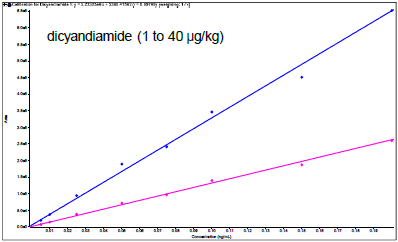 Figure 3 shows calibration lines for dicyandiamide spiked into milk, extracted using the described procedure with a total dilution factor of 200x. Extensive dilution is recommended to accurately quantify the target analyte in matrix samples to minimize possible ion suppression effects which cannot be compensated using an internal standard. Coefficients of regression were determined to be greater than 0.997 for both transitions.