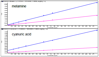 Figure 5 shows example calibration lines for melamine (positive polarity) and cyanuric acid (negative polarity). All calibration lines had r-values of greater than 0.998. Note that the spiked matrix contained traces (< 10 μg/kg) of cyanuric acid and the calibration line does not go through zero.
