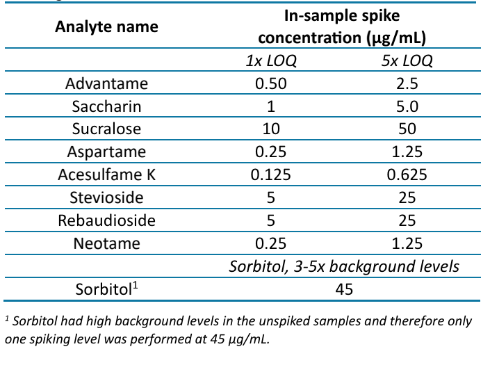 Commercial soft drinks were purchased to evaluate potential matrix candidates for the method development experiments. Although the labels did not indicate the presence of artificial sweeteners, the samples were initially screened to determine potential background levels. All beverages were found to be free of artificial sweeteners except for sorbitol. Ultimately, one cola-based beverage was selected for the matrix spikes. Matrix spikes were performed at 1x and 5x the LOQ for all sweeteners except for sorbitol. Sorbitol was detected in all beverage samples at approximately 12.5 µg/mL. Therefore, sorbitol was spiked at 45 µg/mL which represented 3–5x of the background level. The sample preparation consisted of a simple 500x dilution. The relatively large dilution factor minimized the matrix effects, while still maintaining adequate sensitivity to quantify artificial sweeteners levels in commercial beverages.