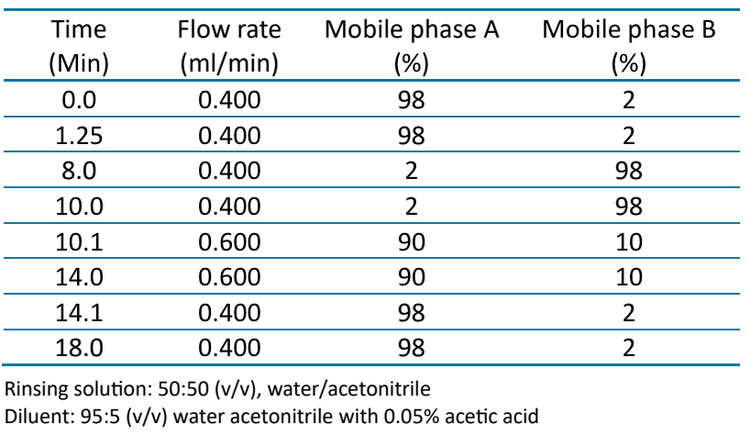 Chromatography: An ExionLC AD system was used with the Phenomenex SynergiTM 2.5 µm Polar RP column for chromatographic separation (100 x 3.0 mm, P/N 00D-4371-Y0). The mobile phases were 10mM ammonium acetate in water and acetonitrile. The flow rate was 0.400 mL/min and the gradient conditions are shown in Table 2. The injection volume was 10 µL and the column oven temperature was 40°C. The autosampler temperature was set to 15°C, and 0.5 mL of rinsing solution was used for the needle washing.