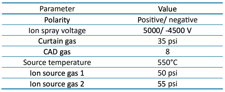 Mass spectrometry: Samples were analyzed on the SCIEX QTRAP 4500 system operated with electrospray ionizavon mode. Data were acquired using multiple reaction monitoring (MRM) with polarity switching. Optimized source and compoundspecific parameters are presented in Tables 3 and 4, respectively. Two selective MRM transitions were monitored (Table 4). Confirmation of the targeted analytes was based on the ion ratio.