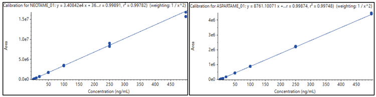 The solvent-based calibration curve was ploted using triplicate injections for each standard level, and a good linear dynamic range was shown with r2 values >0.99 (Table 5). The calibration curves of neotame and aspartame are shown in Figure 3. The mean accuracies were between 84.1% and 108% when considering all analytes across the entire calibration range (Table 5). Good sensitivity was achieved on the SCIEX QTRAP 4500 system and the in-vial LOQs ranged from 0.25 ng/mL to 20 ng/mL in the solvent-based standards. The selection criteria for LOQ were based on the following passing for both the quantifier and qualifier transitions: S/N ratio >10, accuracy ±30% and precision < 15%, and ion ratio tolerance ± 30%. At the LOQ concentration, the mean accuracies ranged from 94.7% to 102%, and the mean %CV ranged from 1.7% to 10% (Table 5).