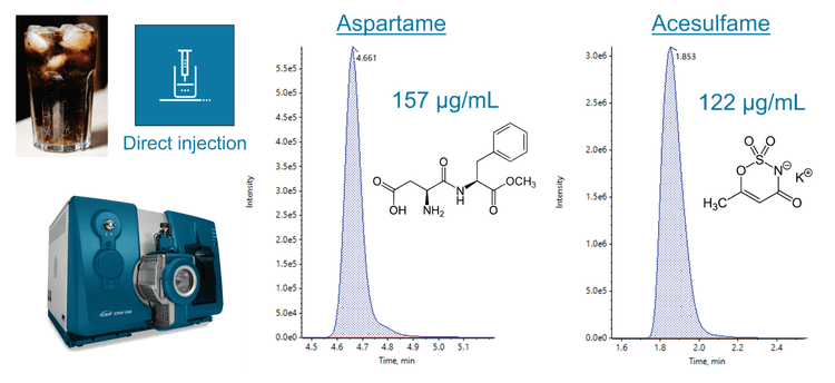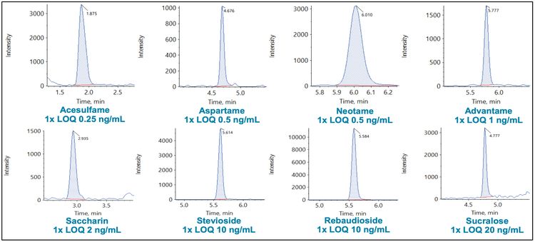 Artificial sweeteners, also known as low- and no-calorie sweeteners (LNCS), are food additives widely used in food and beverages due to their high sweetness and low caloric content. Awareness of diseases linked to natural sugar consumption, such as type-2 diabetes, has increased the use of artificial sweeteners in our food. While many artificial sweeteners are approved for human consumption, the World Health Organization's International Agency for Research on Cancer (IARC) recently designated 1 artificial sweetener, aspartame, as “possibly carcinogenic to humans".1 Accurate and robust analytical methods for the measurement of artificial sweeteners in beverages are necessary for the protection of human health. Methods must be applicable to the diversity of chemical structures in artificial sweeteners including small, polar compounds such as saccharin, and larger glycosides such as stevioside and rebaudioside.