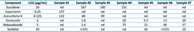 Analysis of commercial beverages. The method was applied to 7 commercially available beverages that listed at least one artificial sweetener on the ingredient list. Sample preparation followed the method above without the additional of the spiking stocks.