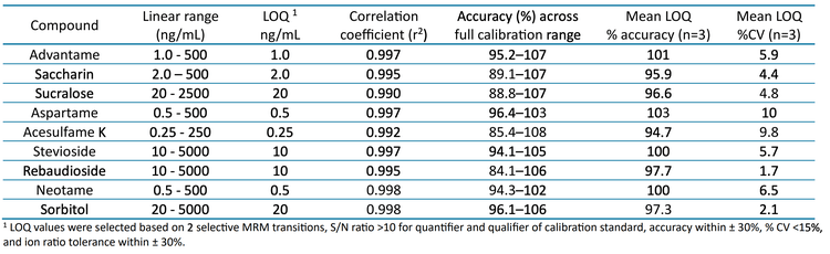 Samples and reagents: Neat standards of the 9 artificial sweeteners were purchased from Sigma Aldrich. Analyte stock solutions of sucralose, aspartame, acesulfame K, stevioside, rebaudioside, and neotame were prepared using LC-MS grade water, while saccharin and advantame stock solutions were prepared using 50:50 (v/v) water/methanol. The calibration standards were prepared using the diluent, 95:5 (v/v) water/acetonitrile with 0.05% acetic acid.