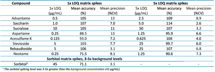 - Method accuracy and precision in matrix spike samples. Matrix spikes showed good accuracy (71.5–114%) and precision (%CV ≤13%) for all the compounds at 1x and 5x LOQ concentrations