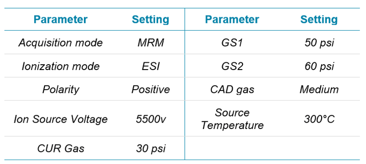 Mass spectrometry: Analysis was performed using the SCIEX Triple Quad 3500 System using the Turbo V™ Ion Source. Parameters are outlined in Table 2. MRM transitions for 222 compounds were optimized and analyzed.