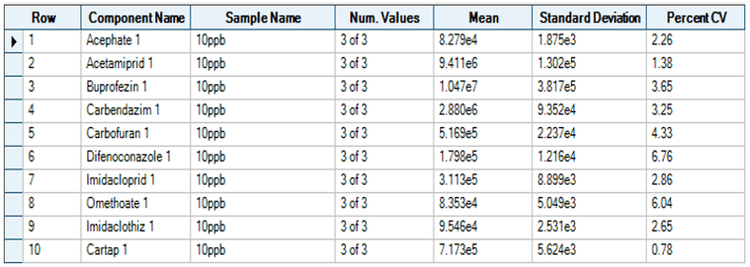 The method demonstrated good reproducibility for a series of replicate injections from the same sample. The statistical performance of the percent coefficient of variation (%CV) was calculated and shows acceptable reproducibility (Figure 3).