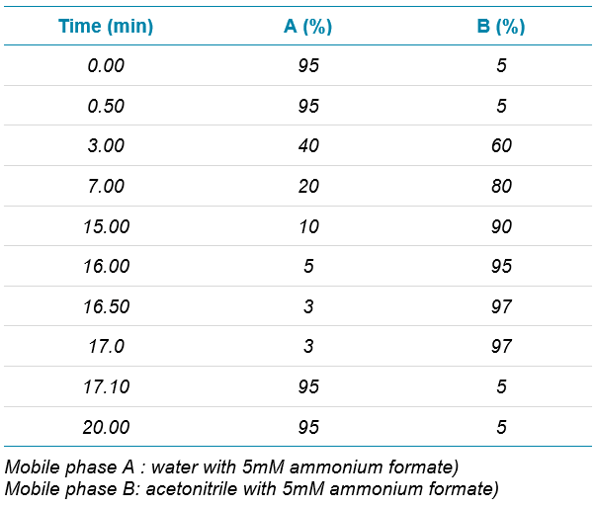 Chromatography: The liquid chromatography for this workflow was performed using a SCIEX ExionLC™ System and a Kinetex Biphenyl column (100 x 3.0 mm, 2.6 µm, Phenomenex). The gradient details are outlined in Table 1. The column temperature was 40°C and the injection volume was 20 µL.