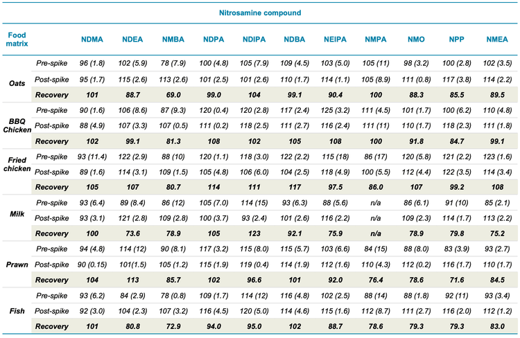 - Broad analyte coverage – 11 different nitrosamine compounds – applied to 6 unique food matrices (milk, oats, fried chicken, chicken, fish, and prawn)