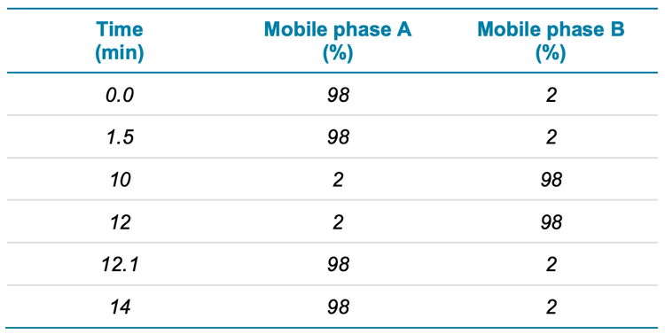 Chromatography: An ExionLC system was used with a Phenyl Hexyl column (3.0 x 100 mm, 3.0 µm, 100 Å) for chromatographic separation. Mobile phase A was 0.1% formic acid in water, and mobile phase B was 0.1% formic acid methanol. Table 1 summarizes the gradient conditions. The mobile phase flow rate was 0.500 mL/min, the column oven temperature was 40°C and the injection volume was 10 uL.