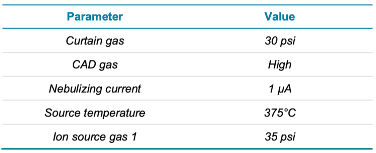 Mass spectrometry: The QTRAP 6500+ system was operated in positive ion mode using APCI ionization. The data was collected using MRM acquisition. Table 2 shows the source and gas parameters, and the compound-specific MRM parameters are displayed in Table 3.