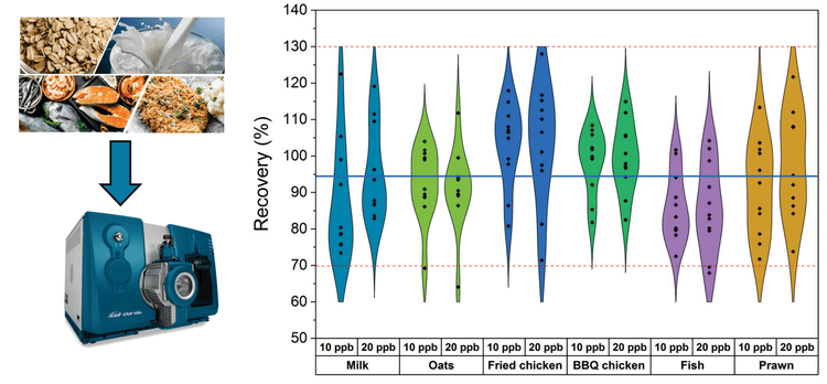 - Low ng/g sensitivity in food matrices. Good sensitivity observed for 10 and 20 ng/g spikes into 6 diverse food matrices (milk, oats, fried chicken, chicken, fish, and prawn)