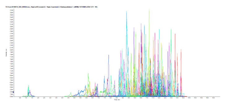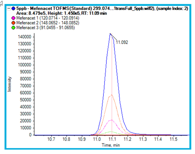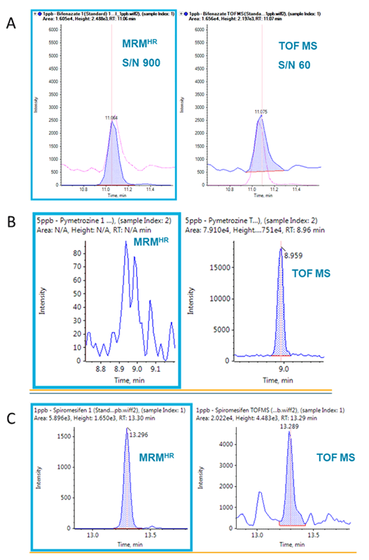Matrix interferences are an obstacle and confidence in identification of residues is paramount. The increased specificity of monitoring an MRMHR transition is one approach which can be utilized to reduce matrix background, baseline, or interferences which may be observed in the TOF MS data trace. However, the signal intensity and peak quality of the transition relies on the efficient formation of the monitored fragment ion. Reduction in signal during precursor transmission and fragmentation results in a lower absolute intensity observed when monitoring an MRMHR transition versus extracted TOF MS ions. Despite this, reduced baseline can still provide greater perceived sensitivity due to drastically reduced baseline and subsequently increased signal to noise ratio. In the presented MRMHR acquisition method, both scans happen simultaneously in a single injection, and processing can utilize either or both, thus reducing or eliminating the need for multiple confirmatory injections or re-injections.