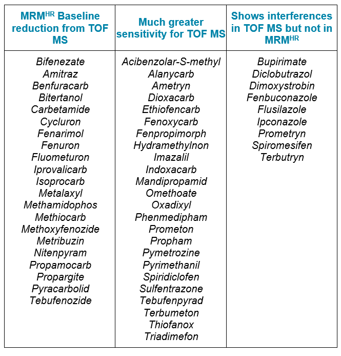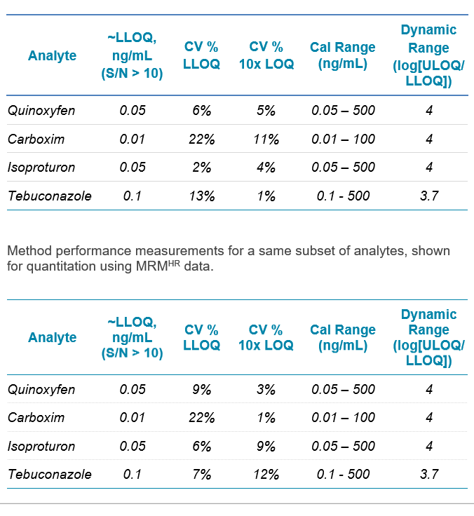 Table 2 shows some example method performance data for a subset of pesticides, comparing quantitation achieved using extracted TOF MS data and MRMHR transitions. In general, the sensitivity achieved for most pesticides in the iD Quant Kit mixture was <0.1 ng/mL in neat solvent and most analytes also exhibited >3.5 orders of linear dynamic range.