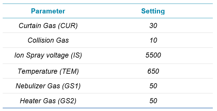 HPLC conditions: Analytical liquid chromatography (LC) separation was achieved using a SCIEX ExionLC™ AD System and a Phenomenex Kinetex XB-C18 LC Column (100 x 3 mm) with mobile phases consisting of A) Water + 5 mM ammonium formate + 0.1% formic acid and B) Methanol + 5 mM ammonium formate. Column oven temperature was 50°C and a 20 μL injection was used. Gradient conditions were used with a run time of 21 minutes for the full gradient with a flow rate of 0.4 mL/min. An example elution profile of the MRM transitions is shown in Figure 2.