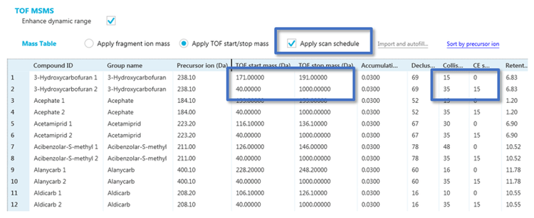 MS conditions: The SCIEX X500R QTOF System with the Turbo V™ Source was operated in positive mode electrospray ionization (ESI). Source parameters are listed in Table 1. The TOF MS scan was conducted over a range of 50 to 1000 m/z. Two different MS acquisition methods are demonstrated. Targeted analysis of the pesticide panel was conducted using an MRMHR experiment including two transitions monitored for each analyte. Additionally, retention time (RT) values were specified for each MRMHR transition, with RT tolerance values of 15 s for each, and the Extended Linear Dynamic Range feature was turned on (Figure 3).