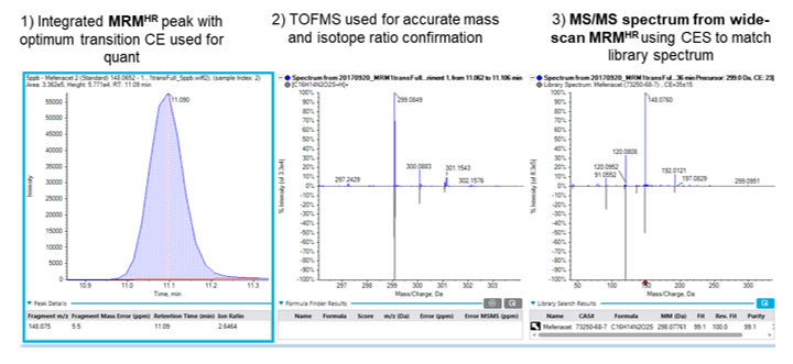 For quantifying a targeted analyte suite or confirming suspect target detections or identities, MRMHR provides high resolution monitoring of known ion transitions as well as full scan product ion spectrum collection. MRMHR can deliver lower baseline and increased specificity for some target compounds, resulting in better signal- to- noise ratios and improved sensitivity in complex matrices. TOF MS quantitation can also be used when greater signal is needed and there is no isobaric interference from the matrix. This combination of scans in a single acquisition allows for selection of the most advantageous quantitation options for analyte and matrix combinations. Full scan MS/MS can be collected in MRMHR mode and searched against a compound library for compound identification or confirmation. Multiple ion ratios for compound confirmation can be generated and can also include TOF MS data in their calculation.