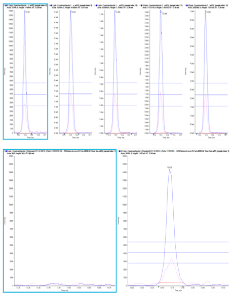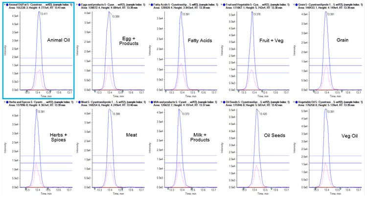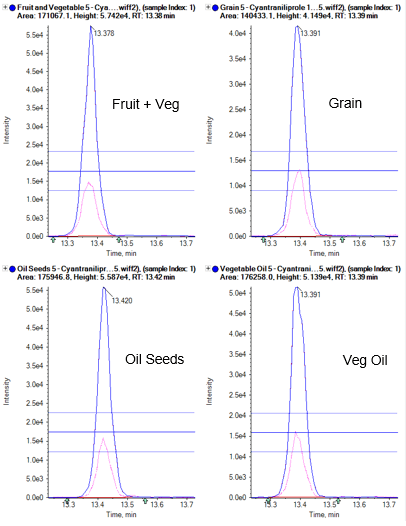 - Improved sensitivity over previous assays with an LLOQ of 0.2 ng/mL in solvent and 5 µg/kg in matrices possible for the majority of compounds analyzed.