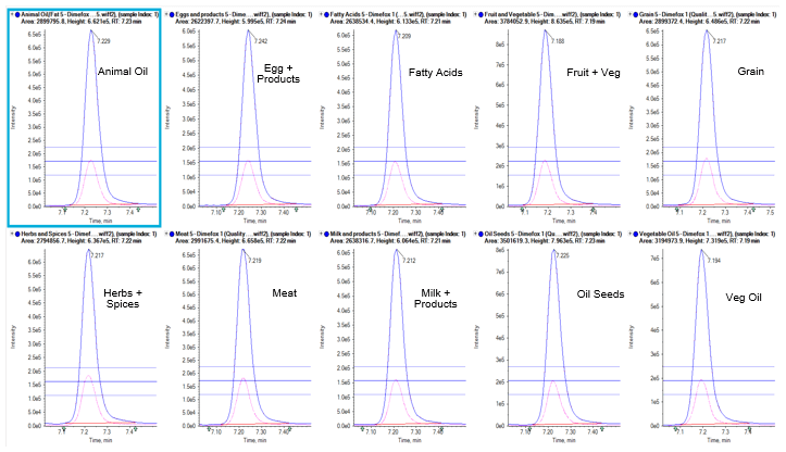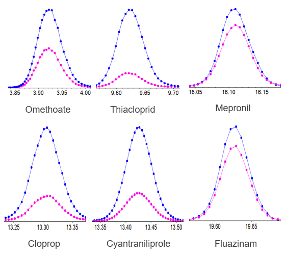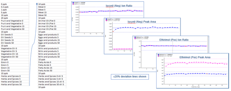 Sample preparation: Ten representative commodities were chosen according to SANTE/12682/2019—fruit and vegetables, grain, oil containing seeds, vegetable oil, spices, milk, eggs, meat, fish oil and fatty acids. Stock solutions were made that contained over 700 different pesticides. Samples were then prepared using the simple protocoldescribed in Supplementary information.3 In brief, 1 gram of food matrix was mixed well with 10 mL of water, then 10 mL of acetonitrile. QuEChERS salt was added and sample was vortexed for 10 mins. Sample was centrifuged for 10 mins, and then frozen. When ready to analyze, samples were thawed, centrifuged for 1 min and the supernatant was ready to inject. Calibration curves were constructed in various prepared food matrices by spiking in pesticides at concentrations of 0.2 to 20 ng/mL.