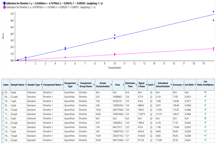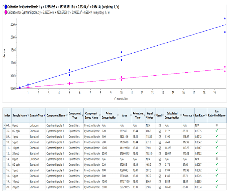 Calibration curves for this broad panel of pesticides were generated in solvent to determine the sensitivity achievable on the SCIEX Triple Quad 7500 LC-MS/MS System – QTRAP Ready. The calibration curves showed high data quality across the concentration range of 0.2 to 20 ng/mL, with an r value above 0.99 and accuracy values at each level being well within acceptable tolerances when concerning trace analysis, 80 to 120% for high concentration and 70 to 130% for low concentration. Good linearity was observed for both transitions across the concentration curves (Figure 6 and 7). Data for selected pesticides is shown in Figure 6 and 7.