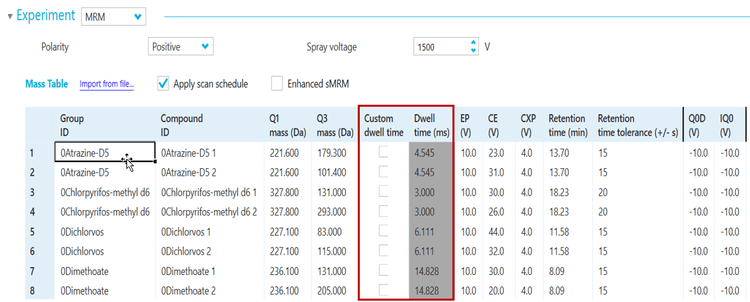 Mass spectrometry: These experiments were performed using the SCIEX Triple Quad 7500 LC-MS/MS System – QTRAP Ready. The system was operated in electrospray ionization (ESI) mode using OptiFlow® Pro Ion Source. To cover the full range of pesticides, both positive and negative ionization mode were used, with rapid polarity switching. Data was acquired using SCIEX OS Software and the Scheduled MRM™ Algorithm to analyze over 1400 MRM transitions in a single injection (Figure 2). Details for MS conditions are outlined in Supplementary information.3