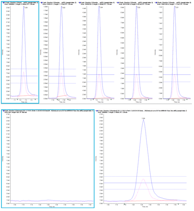 Examples of two pesticides (dimefox and cyantraniliprole) are shown across the 10 matrices to illustrate the data quality. All ion ratios were found to stay within the specified tolerances within each of the 10 matrices analyzed (Figure 8 and 9) highlighting the power of the SCIEX 7500 System for high sensitivity residue testing in food matrices.
