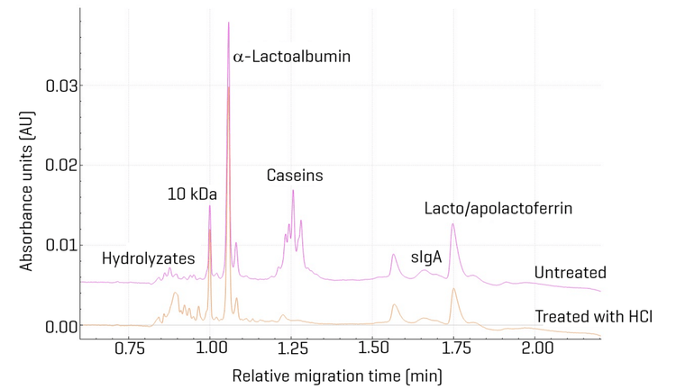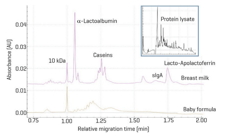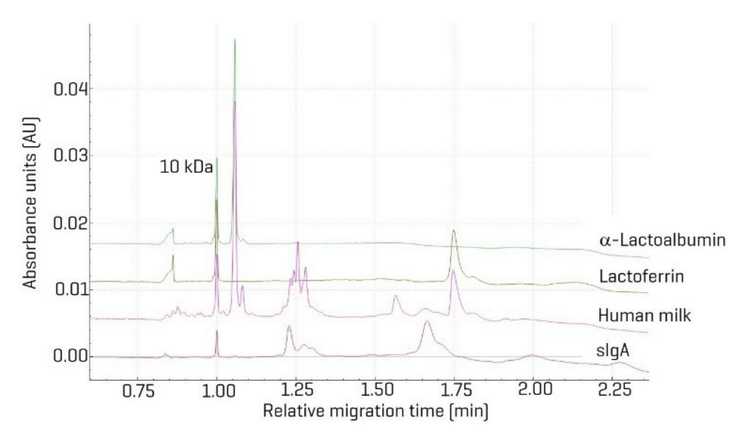 Figure 4 illustrates a comparative CE-SDS analysis of the whey protein fraction from human milk and an easy-digestion baby formula. The electropherograms show distinct differences in protein composition. Key proteins typically found in human milk—α-lactalbumin, lactoferrin, caseins, and immunoglobulin A (IgA)—are notably absent in the easy to digest baby formula sample.