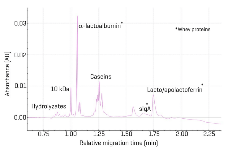 - CE-SDS separation of whey proteins in human milk showed the presence of a-Lactalbumin, caseins, lactoferring and sIgA.