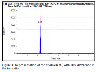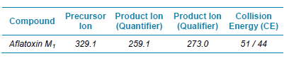 This rapid and sensitive LC-MS/MS method for the quantification of aflatoxin M1 in milk also easily meets the MRL of 0.5 ppb level for this toxin in milk.