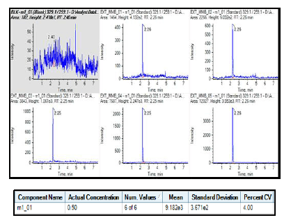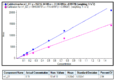 First, the chromatography was optimized to provide a fast 7.5 min run time (Figure 1). Calibration curves were generated across a concentration range of 0.15 to 1.50 ppb of aflatoxin M1 in extracted milk matrix to determine the performance of the method. A LOD of 0.15 ppb was achieved in extracted milk and the %CV (n=10) was still <5%. Good linearity across the range was observed (Figure 2). Reproducibility was evaluated between and within days with the 6 replicates injections and the %CV was found to be <5%, which proves the method is robust and reproducible below its MRL level (0.50 ppb) (Figure 3, bottom). No significant matrix interferences were observed (Figure 3, top). Ion ratios were used to ensure that the correct peaks were integrated in each sample, for added confidence in detection (Figure 4).