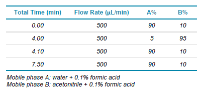 Chromatography: Separation was performed using an ExionLC system with a Kinetex C18 column (1.7 µm, 100 Å, 150 x 2.1 mm). An injection volume of 20 µL was used. The gradient program is shown in Table 1.