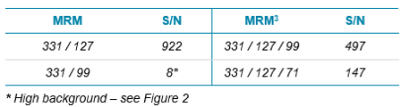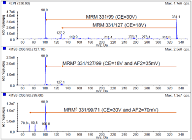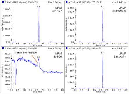 One possibility of improving quantitative results is to use a more selective detection mode, such as MRM3 workflow.1 In comparison to MRM mode, MRM3 often provides higher selectivity due to one additional fragmentation step, effectively reducing interferences and improving quantitation.