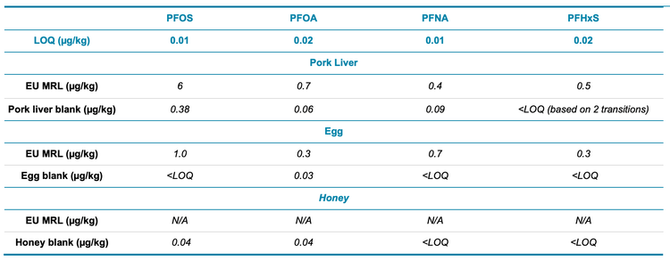 - Positive detection of PFAS was achieved in the unspiked blank food extracts, although the levels were all below their corresponding MRLs
