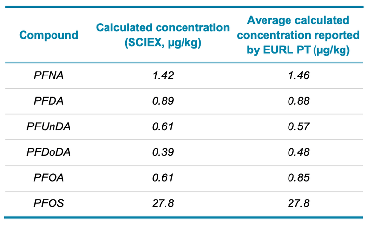 - Calculated concentrations for PFAS compounds in an EURL proficiency test sample (pork liver) were found to be within the satisfactory range (±2 z-score)