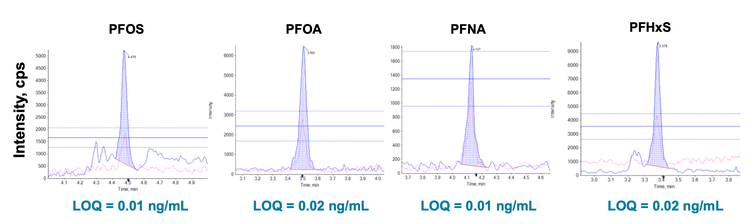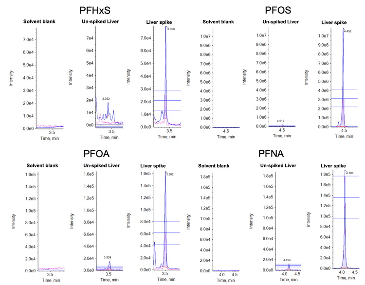 Furthermore, the SCIEX 7500 system provided sufficient sensitivity to detect and quantify the presence of the 4 regulated PFAS in even the unspiked pork liver extract, as shown in Figures 1 and 5.