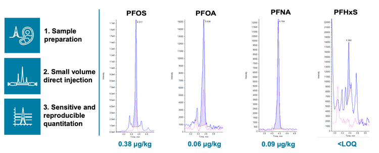 PFAS compounds can enter the food chain either through environmental contamination or migration from food packaging. Based on a risk assessment of PFAS contamination in food on human health, the European Food Safety Authority (EFSA) established a group tolerable weekly intake (TWI) of 4.4 ng/kg body weight for the sum of PFOS, PFOA, PFNA and PFHxS. As a result, MRLs and total limits of the four PFAS were set, to regulate their presence in certain foodstuffs of animal origin as a protective measure against dietary exposure.1 Due to the lack of data for many foods, the Commission also recommended continued PFAS monitoring in a broad range of foodstuffs to assess the need for further regulatory actions.3 PFAS measurements in foods require low limits of quantitation (LOQs),4 which necessitate robust analytical performance and increased instrument sensitivity. Here, the sensitivity of the SCIEX 7500 system was leveraged to allow small sample injection volumes to reduce matrix interferences and to allow the use of solvent-based calibration to simplify quantitation for a wide variety of different food matrices.