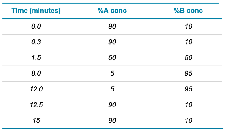 Chromatography: Chromatographic separation was performed using a Phenomenex Luna Omega PS C18, 100 Å, 100 mm x 3 mm, 3 µm analytical column (PN: 00D-4758-Y0) and a Phenomenex Gemini C18, 110 Å, 50 mm x 3 mm, 5 µm delay column (PN: 00B-4435-Y0) (Figure 2). An injection volume of 2 µL and a flow rate of 0.6 mL/min were used. Mobile phase A was 2mM ammonium acetate in water and mobile phase B was 2:1 acetonitrile/methanol. Gradient conditions are shown in Table 1.