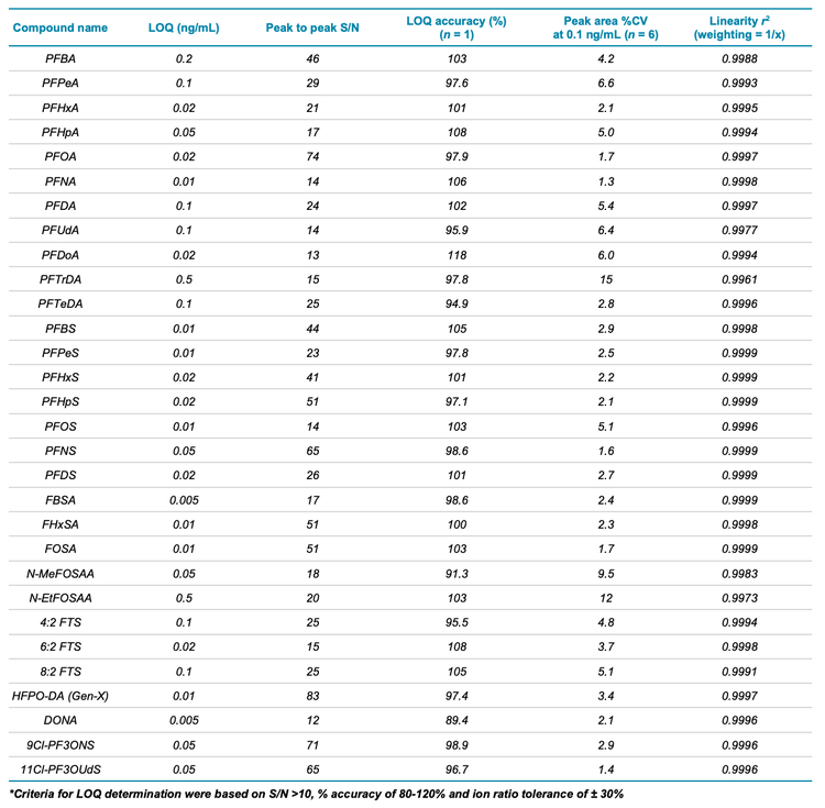 Good linear performance (r 2 >0.995) was achieved for the solvent-based calibration curves for all target PFAS (Table 2). Average accuracy and precision were assessed for 6 replicate injections of a 0.1 ng/mL solvent standard and found to be within acceptable validation requirements (accuracy ±20% and peak area %CV <15%).