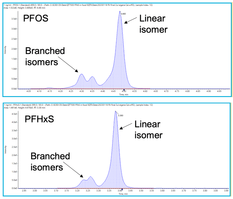 Good chromatographic separation was achieved for all target PFAS (Figure 2), including the branched and linear isomers of PFHxS and PFOS (Figure 3). Although the MRLs apply to the sum of linear and branched stereoisomers, chromatographic separation can help distinguish their individual contribution to any observed detection by using isomer-specific standards.
