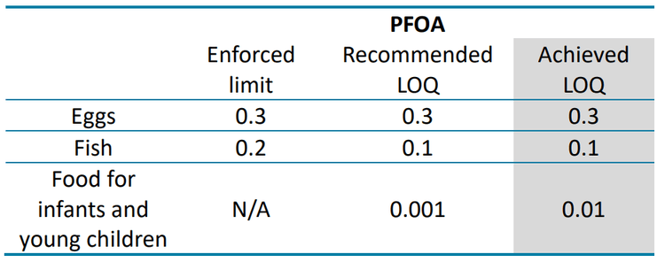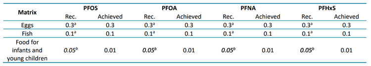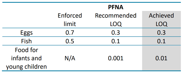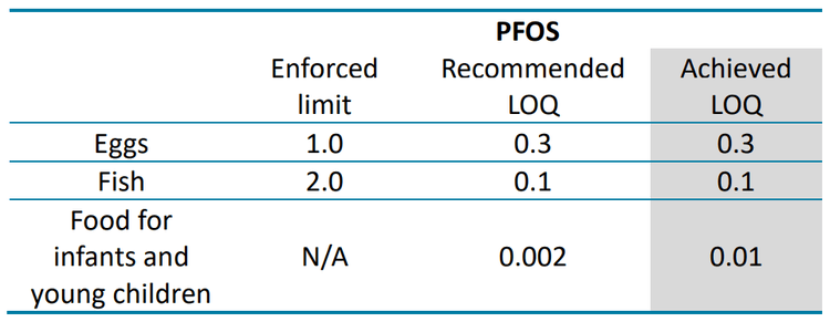 In August 2022, the European Union (EU) released the Commission Recommendation EU 2022/1431, which suggested LOQs for PFOS, PFOA, PFNA and, PFHxS in several food matrices, including fruits and vegetables, fish and meat, eggs, fish oil and food for infants and young children. The lowest LOQs recommended for fruits, vegetables and, foods for infants and young children ranged from 0.001 µg/kg to 0.004 µg/kg depending on the compound. In the EURL POPs guidance, the scope of analytes without required LOQs included 32 additional compounds. In December 2022, the Commission Regulation EU 2022/2388 established maximum levels (MLs) for PFOS, PFOA, PFNA and, PFHxS, in eggs, fish and meat foodstuffs. The lowest MLs for PFOA and PFHxS were set at 0.3 µg/kg in eggs and for PFOA, PFNA and PFHxS were set at 0.2 µg/kg in fish and meat (beef, pork, poultry and sheep) intended to produce food for infants and young children. The ML applies to the sum of linear and branched isomers, whether they are chromatographically separated or not. Tables 2-5 below present the LOQs achieved for the 4 regulated compounds, compared with the enforced and and recommended limits. These results show that for the 4 regulated compounds, the enforced limits were easily met with the established method. The LOQs recommended by the EU were achieved for eggs and fish. The limit recommended for infant food, however, was not achieved, as the lowest level achieved was 0.010 µg/kg.