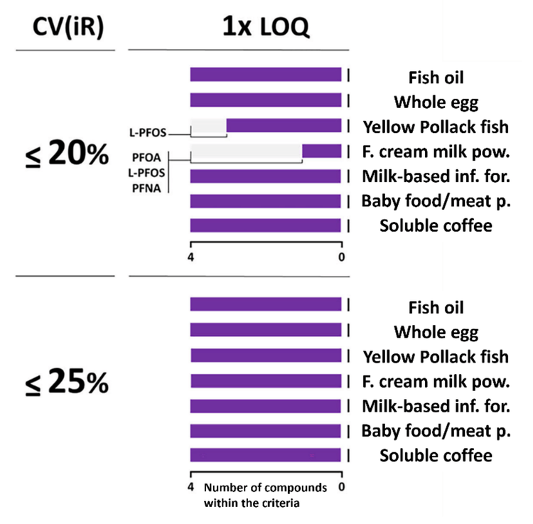 - analyzed at both the LOQ and at 5x LOQ. For many of the compounds analyzed, the criteria defined in the EURL POPs guidelines were achieved. It is of note however, that some compounds fell outside of the criteria. The yellow pollack fish was a more challenging matrix to analyze and had the most compounds that did not meet the criteria. In addition, PFBA, PFPeA, HPFHpA, PF4OPeA, NMeFOSE-M and N-EtFOSE-M used only one transition and capstone A and B were only included in full cream powder, baby food and milk-based infant formula.2