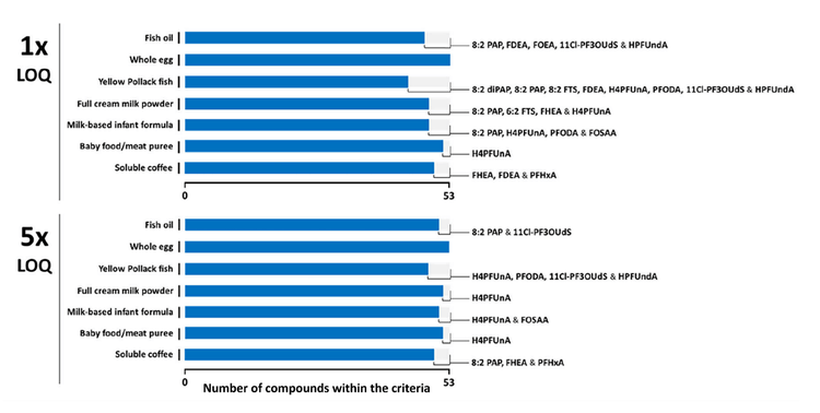 The scope of analytes quantified includes compounds listed in both the Commission Recommendation EU 2022/1431 and, the U.S. Food and Drug Administration method for PFAS analysis in processed food. Several compounds were also included that were surveyed by service laboratories in Europe and mentioned in literature.3-4 The Commission Regulation EU 2022/2388 was followed to ensure that enforced limits were met for the relevant PFAS compounds mentioned.