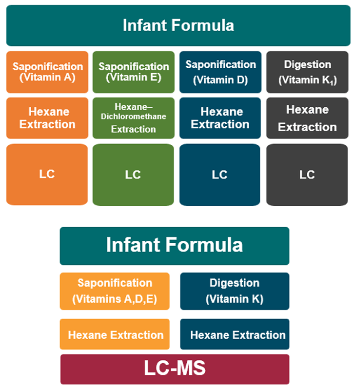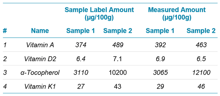 Fat-soluble vitamins (lipid-soluble vitamins) are essential nutrients for infant food as they have important roles in several functions in the human body, such as vision (Vitamin A), calcium metabolism (Vitamin D), antioxidative protection in cell membranes (Vitamin E) and blood clot (Vitamin K). CODEX STAN 72-1981 contains minimum and maximum content requirements of fat-soluble vitamins in infant formula. Reliable, sensitive and rapid methods for measuring fat-soluble vitamins in infant formula are essential for nutritional reasons.