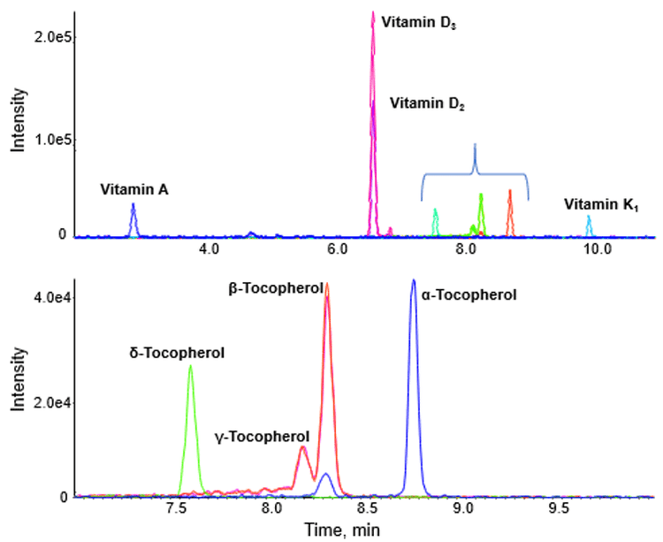 In recent years, LC–MS shows great sensitivity and specificity for the determination of vitamins and permits the simultaneous analysis of multiple vitamins in a single analysis. According to AOAC methods, analysis of fat-soluble vitamins requires combination of several methods, such that the entire process is very cumbersome and time-consuming. Using SCIEX QTRAP 4500 System, 8 fat-soluble vitamins were successfully analyzed in 15 min, as seen in Figure 2. Four tocopherol isomers (α-tocopherol, β- tocopherol, γ- tocopherol, δ- tocopherol) were easily resolved using this separation method, shown in Figure 2 (bottom).