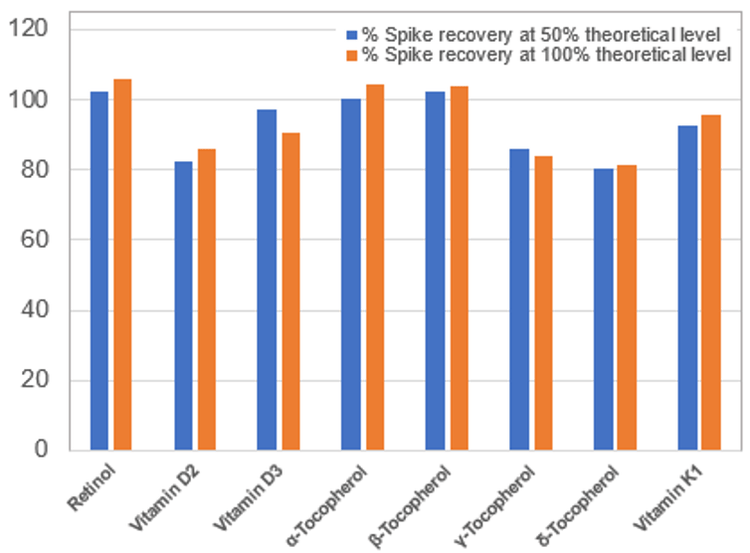 Fat-soluble vitamins, especially for vitamins A and E, could be destroyed under the presence of oxygen, light, heat and storage time. During the extraction process, samples were always protected from direct exposition to light and protected by antioxidant to minimize degradation. Stable isotope-labeled internal standards are used in the method to correct significant reduction of vitamins degradation and matrix effect. Recoveries at both spiking levels were between 80.53% and 105.96%, which demonstrated excellent accuracy for this assay (Figure 3).