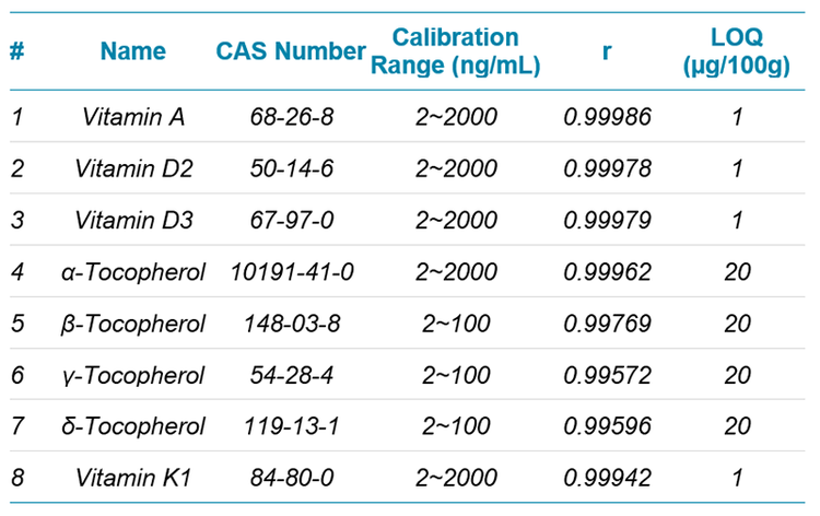 Calibration range, coefficients of determination and limits of quantitation (LOQ) of 8 fat-soluble vitamins are shown in Table 1.